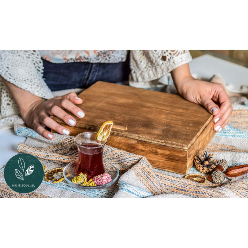 ابعاد جعبه 29 در 23 سانتیمتر. درب و بدنه چوبی. شش مدل دمنوش بسته بندی شده